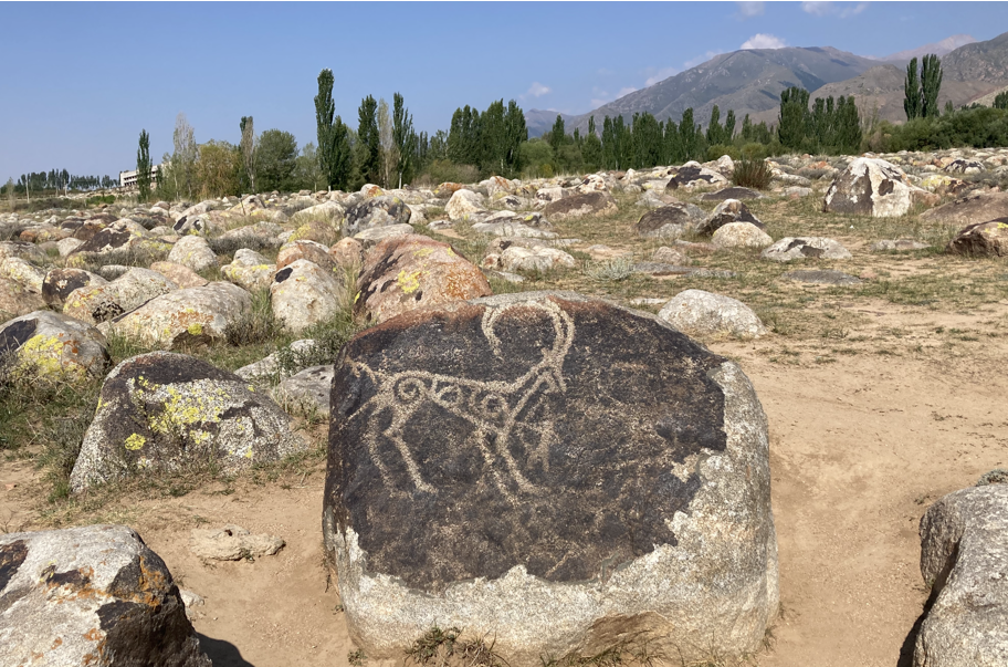 ・イシククル湖北側の街、チョルポンアタでは岩絵、対岸の山々と湖畔の美しい景色が楽しめる